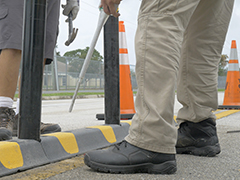 First, take extra care of the lay-out and drilling of the holes, If it isn’t straight, it will look odd and the posts line up well with the Orca curb. The other thing we learned is that the roadway surface should be scraped clean of things like excessive butyl or marking materials. The flat surface will insure that the posts line up and it will be a clean uniformed job.I sent two guys ahead of our assembly line with prybars and scrapers to remove excess butyl left over from the previous products installed.